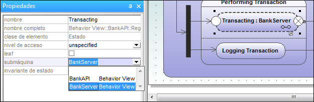 Observe que en la submáquina aparece automáticamente un icono de hipervínculo. Al hacer clic en este icono se abre la máquina de estados a la que se hace referencia (BankServer, por ejemplo).