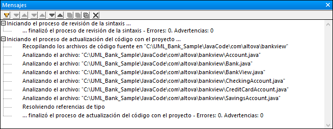 La ventana Mensajes muestra mensajes de advertencia, sugerencias y errores que pueden aparecer al revisar la sintaxis del proyecto (véase Revisar la sintaxis del proyecto) o al realizar tareas de ingeniería de código. Para obtener más información sobre la ingeniería de código, consulte los apartados Generar código de programa e Importar código fuente.