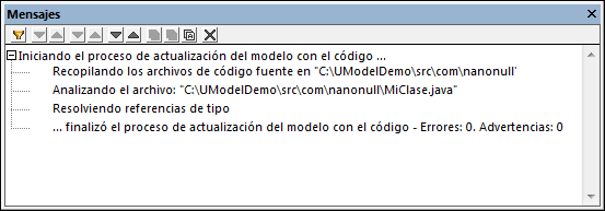 Si se valida el proyecto en este momento, la ventana Mensajes emite el error de validación "No se encontró la raíz de espacio de nombres. Utilice el menú contextual (submenú "Ingeniería de código") en la estructura del modelo para definir un paquete como raíz de espacio de nombres." Para resolver este problema asignaremos el paquete src como raíz de espacio de nombres: