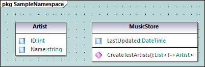 A continuación, cree las clases, los tipos y demás elementos necesarios para su modelo, como un diagrama simple que contenga la clase Artist y la clase MusicStore (imagen siguiente). Para ello siga estas instrucciones: