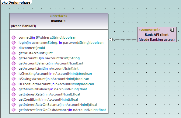 Como puede ver en la imagen siguiente, ahora los dos paquetes tienen una dependencia de utilización con la interfaz. Es decir, los paquetes BankView y BankView GUI necesitan a la interfaz IBankAPI. Esta interfaz la aporta el paquete Bank API Client.