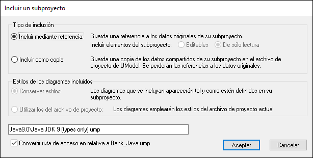 Aunque este paso es opcional, recomendamos que incluya los tipos del lenguaje JDK (Jave Development Kit) como subproyecto de su proyecto de UModel. De lo contrario, los tipos JDK no estarán disponibles cuando cree las clases o interfaces. Esto se puede hacer de la siguiente manera (las mismas instrucciones pueden seguirse para C# y VB.NET):