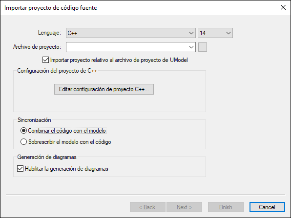 Para importar proyectos en C++ a UModel, use el comando de menú Proyecto | Importar proyecto de código fuente.