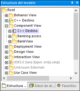 •La Estructura del modelo ahora incluya un paquete C++ Target. Este paquete contiene todos los elementos transformados desde el modelo de origen Java y adaptados a C++. Por ejemplo, si abre el diagrama "BankView Main" notará que contiene el tipo bool, cuando en Java el tipo es boolean.