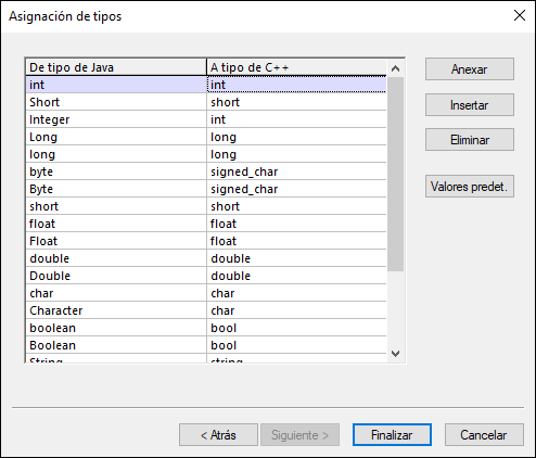 6.Haga clic en Siguiente. Se abrirá el cuadro de diálogo "Asignación de tipos", en el que puede definir el tipo de asignación entre Java y C#. Haga clic en Finalizar para usar la configuración predeterminada.