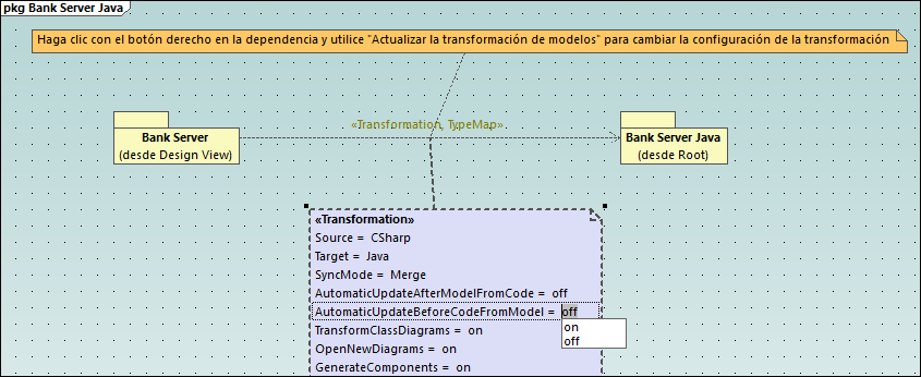 Haga clic con el botón derecho en la relación de dependencia del diagrama y seleccione Actualizar la transformación de modelos del menú contextual o