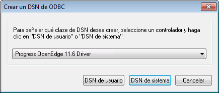 3.Seleccione Progress OpenEdge Driver en la lista desplegable (imagen siguiente) y haga clic en DSN de usuario (o DSN de sistema si procede).