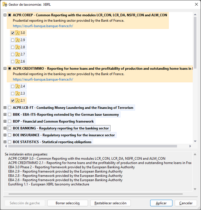 •Con el archivo .altova_TAXONOMIES que se descarga del Centro de descarga de taxonomías XBRL de Altova: Haga doble clic en el archivo descargado para ejecutar la interfaz gráfica del usuario de Gestor de taxonomías, que se configurará para instalar las taxonomías que haya seleccionado (en el sitio web).