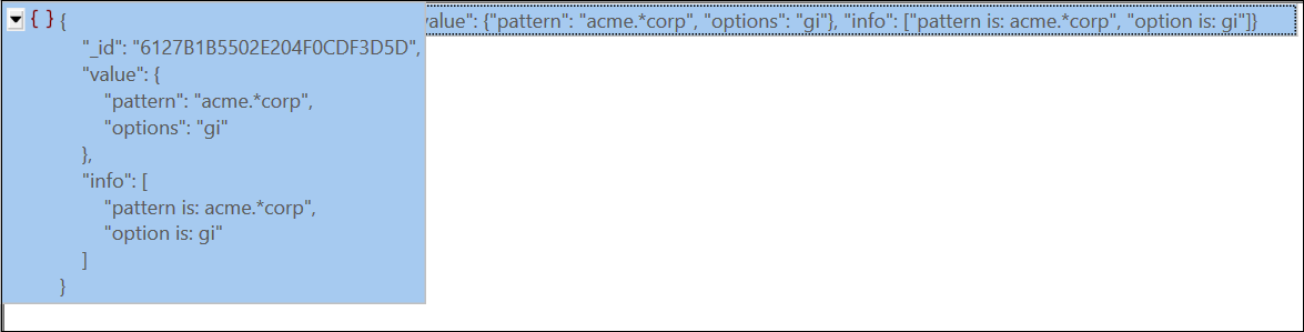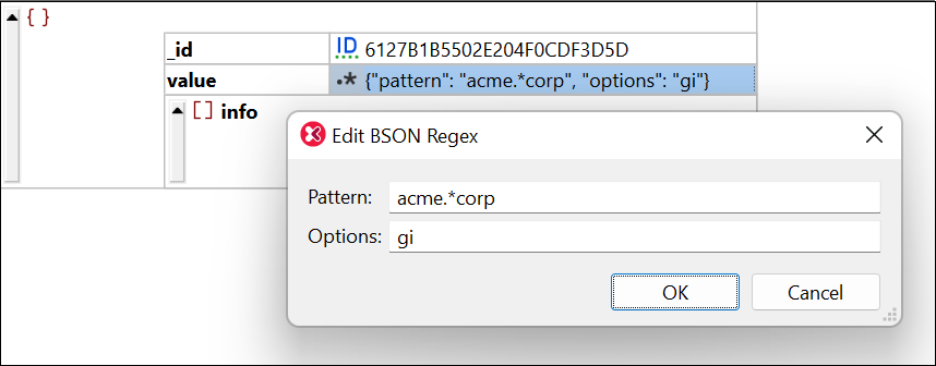 •binData, regex, timestamp y dbPointer (obsoletos) tienen un par de valores. Muestran una vista previa similar a JSON y los valores se pueden editar a través de cuadros de diálogo (imagen siguiente).