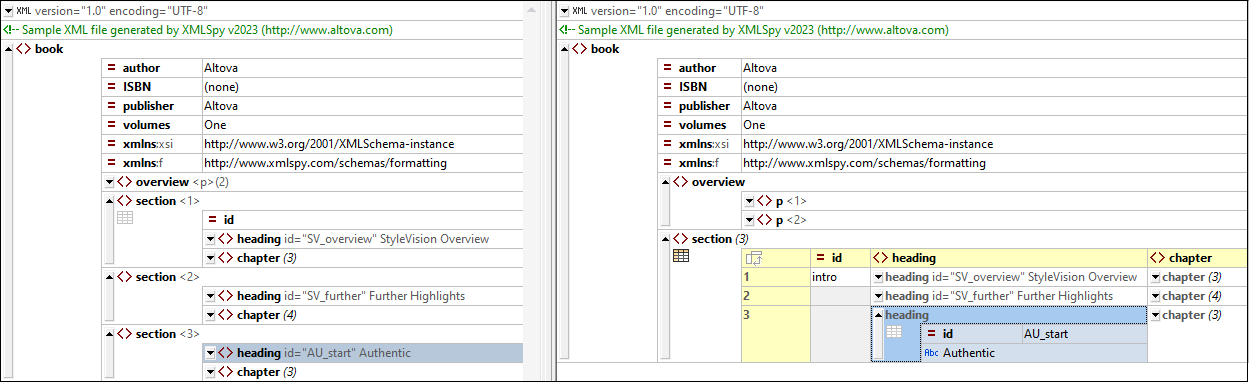 La vista dividida reparte la ventana principal de la vista Cuadrícula (para documentos XML, JSON y DTD) en dos partes verticales u horizontales y muestra el documento activo en ambas partes. Es decir que tendrá dos vistas del documento activo simultáneamente. Puede navegar de forma independiente en cada una de las ventanas, lo que permite consultar dos partes distintas del mismo documento una junto a la otra. Si realiza algún cambio en una de estas vistas, éstos también se aplicarán en el documento subyacente y se reflejan inmediatamente en la otra vista.