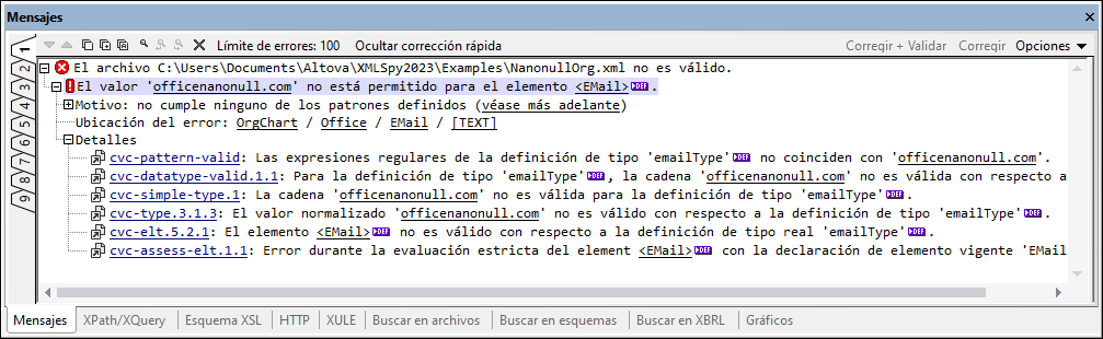 La ventana Mensajes está habilitada en todas las vistas, pero si hace clic en un hipervínculo al contenido del documento XML, dicho nodo se resaltará en el documento XML en la vista Texto. Sin embargo, si se valida un esquema XML en la vista Esquema, al hacer clic en el botón Def color púrpura, la vista no cambiará.