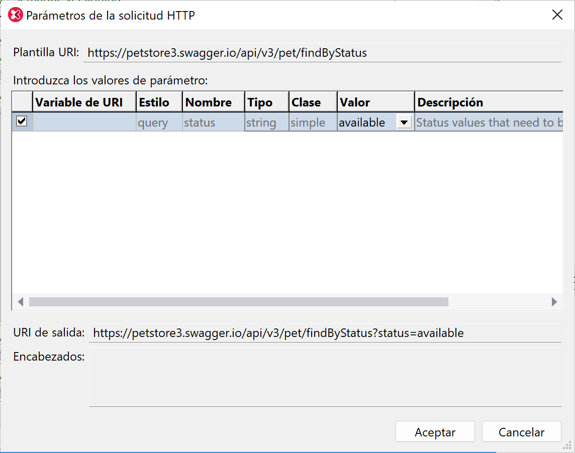 4.Al hacer clic en Aceptar, aparece el cuadro de diálogo Parámetros de la solicitud HTTP (imagen siguiente). Los valores que se han definido en el documento OpenAPI para este parámetro aparecerán en el cuadro combinado de la columna Valores. Seleccione el valor que desea y haga clic en Aceptar.