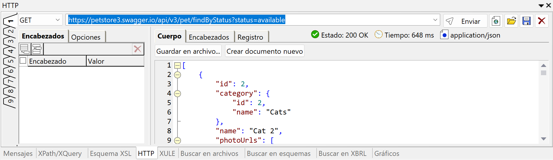 En XMLSpy, puede crear solicitudes HTTP a partir de un documento OpenAPI. El procedimiento siguiente describe cómo hacerlo creando una solicitud HTTP GET a partir de un archivo de documento OpenAPI y enviando la solicitud a un servicio web.