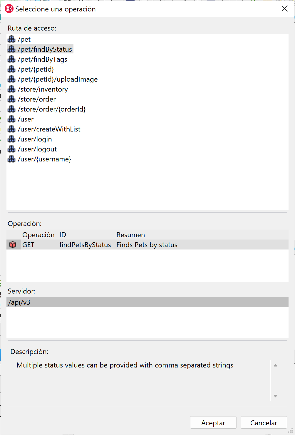 3.En el siguiente cuadro de diálogo, Seleccione una operación, debe seleccionar la ruta y la operación que desee. Por ejemplo, en la imagen siguiente, la ruta seleccionada es /pet/findByStatus y su operación GET es la operación seleccionada.