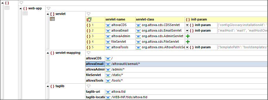 Además, si un nodo se repite (como los objetos de la matriz servlet de la imagen anterior), en lugar de que cada objeto se repita en orden serial, pueden mostrarse en formato de tabla, donde las claves de los pares clave-valor de los objetos se muestran como columnas de la tabla y cada objeto se muestra en una fila numerada (véase la tabla de la imagen anterior).