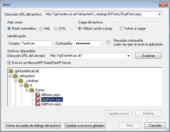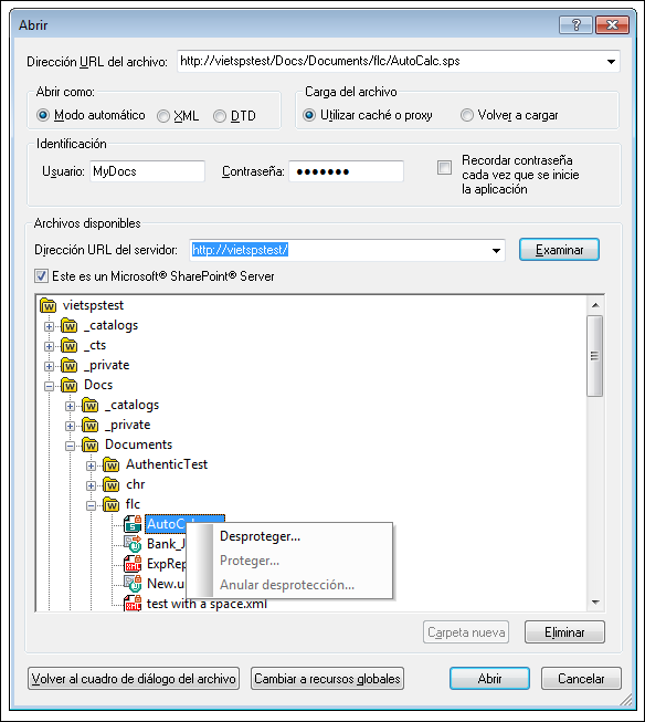 2.Escriba la URL en el campo Dirección URL del servidor: (imagen anterior). Si el servidor es un servidor Microsoft® SharePoint® Server, marque la casilla Microsoft® SharePoint® Server. Consulte la nota sobre este tipo de servidores que aparece más abajo. 3.Si el servidor está protegido con contraseña, escriba el ID de usuario y la contraseña en los campos correspondientes. 4.Haga clic en Examinar para navegar por la estructura de directorios del servidor. 5.Busque el archivo que desea cargar y selecciónelo. El archivo URL aparece en el campo URL del archivo (imagen anterior). En ese momento se habilita el botón Abrir/Guardar. 6.Haga clic en Abrir para cargar el archivo o en Guardar para guardarlo.