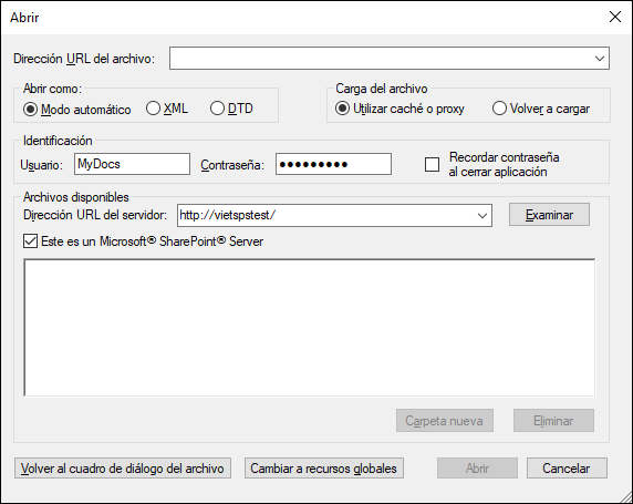 En varios cuadros de diálogo "Abrir archivo" y "Guardar archivo" de XMLSpy podrá seleccionar o guardar el archivo a través de una URL o un recurso global (imagen siguiente). Haga clic en el botón Cambiar a URL o Cambiar a recursos globales según corresponda.