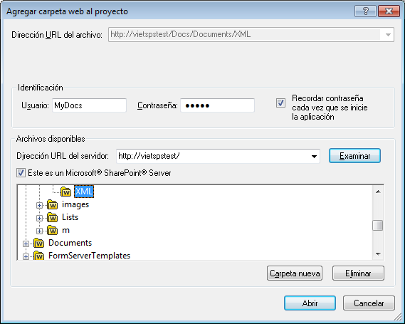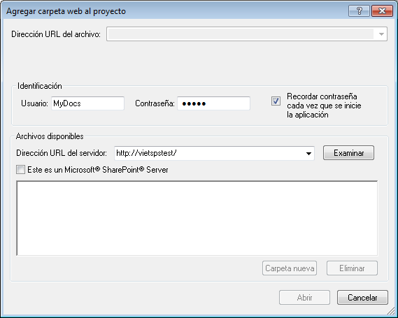 | 5. | Haga clic en la carpeta que desea agregar al proyecto. El botón Abrir no se habilita hasta que no seleccione una carpeta. La URL de la carpeta aparece ahora en el campo Dirección URL del archivo. |