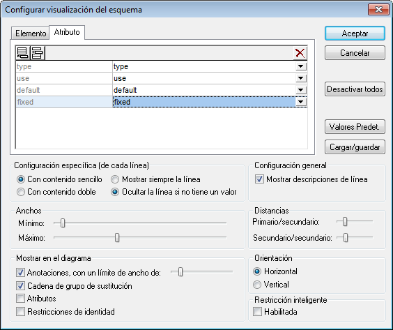 La vista del modelo de contenido se puede configurar en el cuadro de diálogo "Configurar visualización del esquema". En los párrafos anteriores explicamos cómo añadir líneas de descripción de propiedades a la vista del modelo de contenido. Las demás opciones del cuadro de diálogo se describen a continuación.