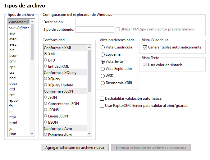 En la sección Tipos de archivo (imagen siguiente) puede adaptar a sus requisitos el comportamiento de XMLSpy dependiendo del tipo de archivo.