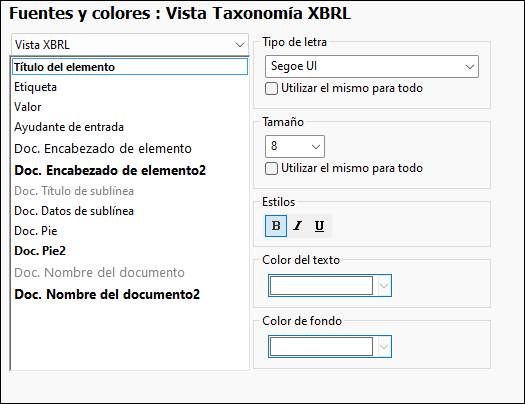 La sección Vista Taxonomía XBRL ofrece opciones para personalizar el aspecto de los componentes de texto en la vista XBRL (imagen siguiente).