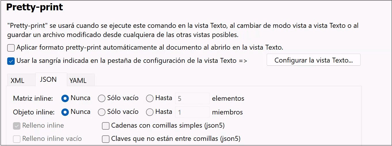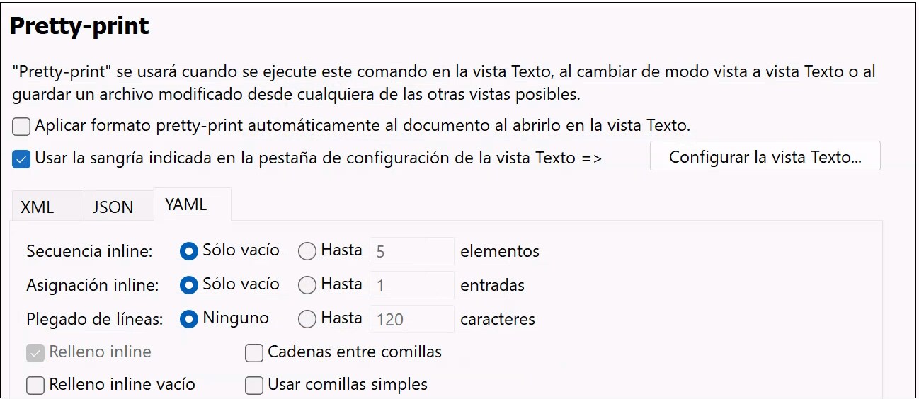 La casilla Usar la sangría indicada activa o desactiva el formato pretty-printing. Si marca la casilla Aplicar formato pretty-print automáticamente este formato se aplicará automáticamente al cargar el documento.