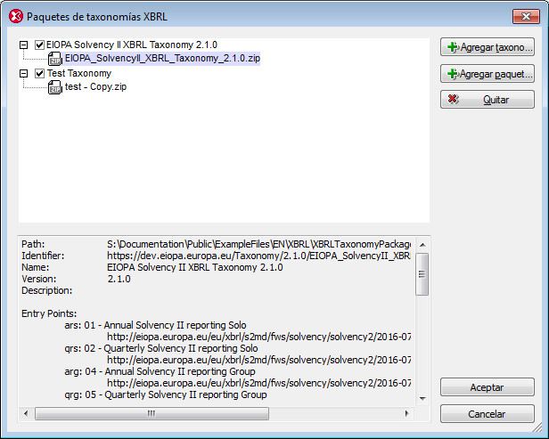 Tras descargar el paquete de taxonomía, podrá configurar XMLSpy para que identifique y utilice el archivo de catálogo de punto de entrada del paquete automáticamente. Para ello basta con añadir el paquete a la lista de paquetes de taxonomías activos. XMLSpy utilizará los archivos de catálogo de los paquetes activos para encontrar recursos para las diferentes operaciones, como por ejemplo las tareas de validación XBRL. Puede agregar dos tipos de paquetes de taxonomía: