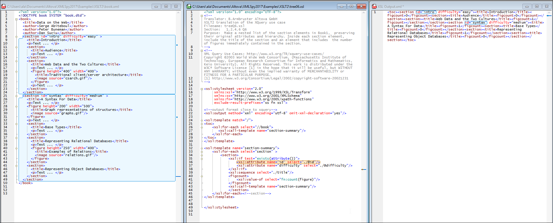 En la imagen siguiente puede ver la asignación inversa de una transformación XSLT. Los tres documentos se presentan en forma de mosaico vertical y en paralelo (XML+XSLT+Resultado). El usuario hizo clic en la instrucción XSLT que da lugar al atributo section/@id del documento de salida. La aplicación resaltan todos los nodos resultantes que genera la instrucción, así como los datos XML de origen que se usaron para generar el nodo. También se puede hacer clic en los nodos del documento de salida o del documento XML para resaltar los nodos correspondientes en los otros dos documentos.