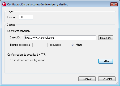 •Puerto y dirección de destino: estas opciones vienen dadas por el archivo WSDL seleccionado en el paso anterior y se introducen automáticamente. El puerto predeterminado es el número 80. Puede definir un tiempo de espera para la conexión o marcar la casilla Infinito si prefiere no definir un tiempo de espera. Para definir la configuración de seguridad HTTP haga clic en el botón Editar y elija la configuración correspondiente. Para más información consulte el apartado Configuración de la solicitud SOAP.