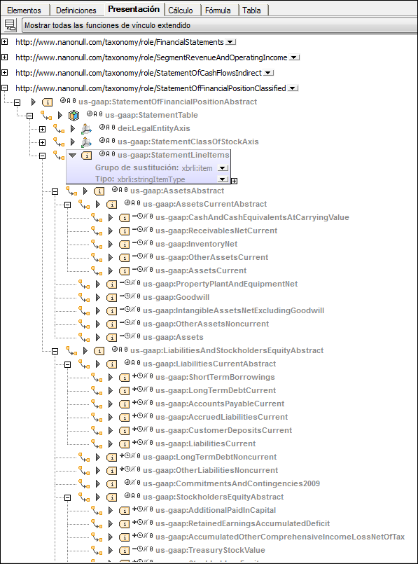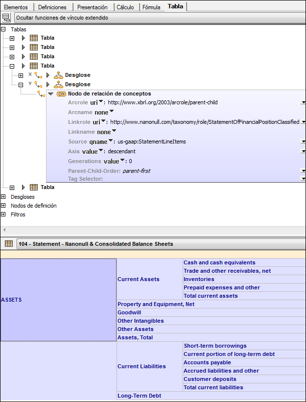 Un nodo de relación de dimensiones o de relación de conceptos da como resultado un árbol de nodos estructurales, definidos por las redes de conceptos o miembros de dimensión explícita de la DTS. Por tanto, el componente del árbol de definiciones corresponde a un bloque de celdas en el diseño.