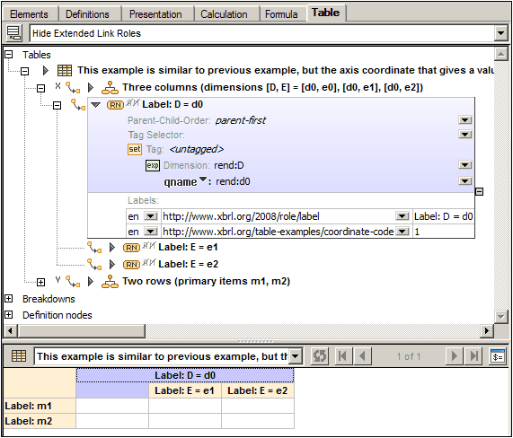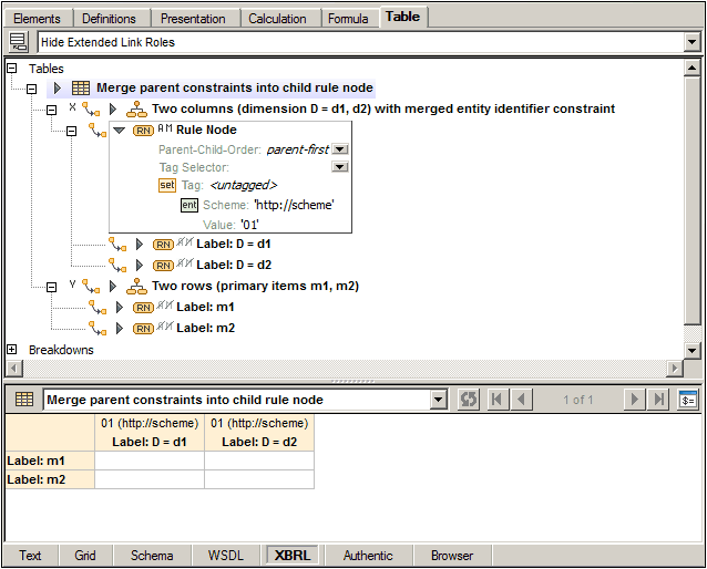 Un nodo de regla define reglas de aspecto para uno o varios aspectos: concept, period, unit, entity identifier, dimension u open content. El componente de la estructura de la definición se corresponde con una celda del diseño si el nodo de regla es de tipo abstracto y no tiene secundarios. De lo contrario, el diseño contiene una celda "acumulada" más cuya posición viene dada por el valor real de la propiedad parentChildOrder del nodo de regla.