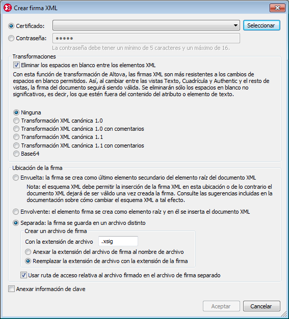 La opción Anexar información de clave está disponible si la firma está basada en un certificado. Si la firma está basada en una contraseña, esta opción se deshabilita.