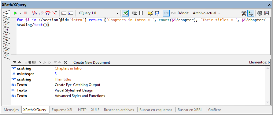 En el ejemplo de la imagen anterior se realizó una consulta para un elemento llamado section que tiene el atributo @id='intro'. La consulta devuelve el número de apartados de esta sección intro y sus títulos.