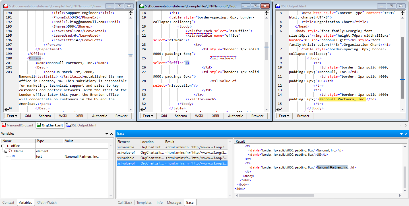 Con el depurador XSLT y XQuery puede depurar hojas de estilos XSLT y documentos XQuery. Aquí aparecen las distintas vistas del documento XSLT o XQuery , el documento XML/JSON de origen y el documento de salida. Puede recorrer el documento XSLT/XQuery paso a paso para ver el resultado que genera cada uno de los pasos. En cada paso se resaltan las respectivas posiciones en el documento XML/JSON, el documento XSLT/XQuery y el documento de salida, y la información del depurador aparece en las ventanas secundarias del depurador.