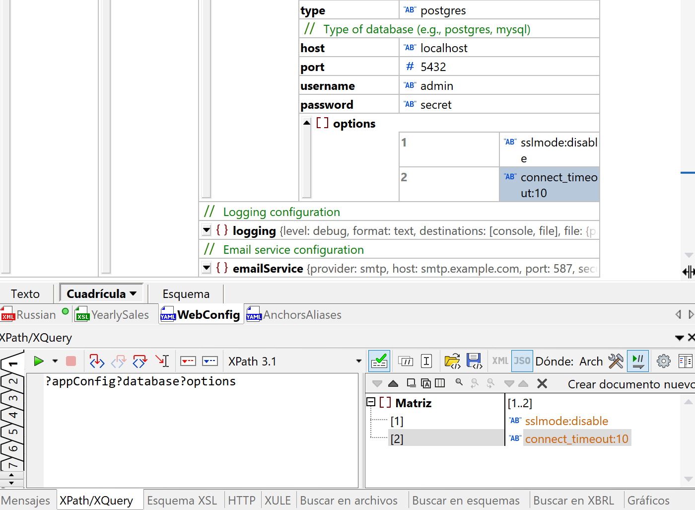 Para obtener más información sobre las expresiones XPath/XQuery en formato JSON, que se pueden usar con documentos YAML, consulte Expresiones XQuery para JSON.