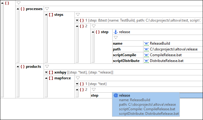 Para obtener la expresión localizadora XPath/XQuery de un nodo en el documento YAML, haga clic dentro del nodo y seleccione el comando Edición | Copiar XPath. La expresión XPath/XQuery se copiará en el portapapeles en formato JSON. Basta con pulsar Ctrl+V para pegar la expresión localizadora en cualquier campo de entrada de texto.