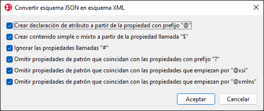 En la parte superior del cuadro de diálogo se explica cómo se convierten ciertos componentes del esquema XML. En la parte inferior del cuadro de diálogo puede configurar estas opciones: