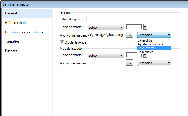 En el cuadro de diálogo "Cambiar aspecto" las opciones de configuración se dividen en pestañas, algunas comunes a todos los tipos de gráfico y otras propias de cada tipo.