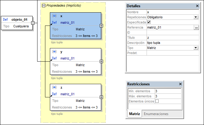 Las tres matrices de este ejemplo tienen la misma definición. Cada una de ellas contiene tres elementos ordenados de esta forma: (i) primero un número, (ii) después otro número y (iii) por último una cadena de texto. Más abajo puede ver este objeto en el esquema. Como las tres matrices tienen la misma definición, se creó una definición en una matriz global llamada matriz_01. Cada una de las tres matrices (x, y y z) remite a la matriz global matriz_01.