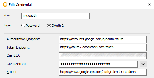 2.Double-click the credential record ("my.oauth", in this example) and clear the Include in MapForce Server Execution File and Mapping Deployment check box.