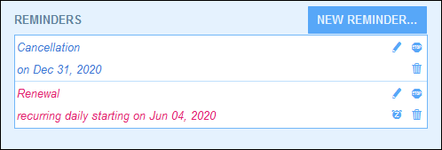 Les rappels et les e-mails de rappel sont configurés par les administrateurs de système. Néanmoins, les utilisateurs détiennent la décision finale concernant les rappels envoyés, quand et à qui. Les utilisateurs peuvent gérer les rappels en supprimant ou en modifiant des rappels et en créant de nouveaux rappels. Généralement, l’accès aux rappels sera mis à la disposition des utilisateurs sous la forme d’un formulaire, par exemple, un formulaire d’entrée. La capture d’écran ci-dessous, par exemple, montre des parties d’un formulaire d’entrée de données pour des contrats.