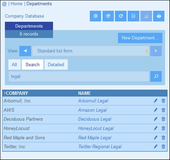 1.Dans la liste de choix Mode d’un conteneur, choisir un formulaire de liste d’enregistrement pour afficher les enregistrements du conteneur. Par exemple, la capture d'écran ci-dessous montre les enregistrements dans le conteneur Departments, avec les enregistrements contenus dans un formulaire de liste nommé Standard list form.