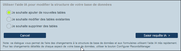 RecordsManager utilise l’API de OpenAI pour vous permettre de modifier rapidement votre structure et faire des changements à vos formulaires. Cette section, décrit comment utiliser l’assistance AI dans RecordsManager.