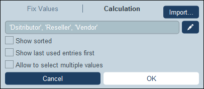 En alternative, sélectionnez l’onglet de calcul pour saisir une expression XPath qui évalue une séquence d’items. Dans la capture d’écran ci-dessous, nous utilisons une expression XPath pour générer la même liste d’items que nous obtenons en saisissant les valeurs dans la capture d’écran ci-dessus. L’expression XPath est : 'Distributor', 'Reseller', 'Vendor'.