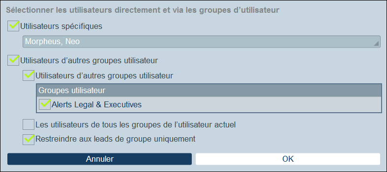 •Utilisateurs spécifiques, par nom •Les utilisateurs des groupes d’utilisateurs où il y a des options en termes de quels groupes et de quels utilisateurs sont dans les groupes (voir la capture d’écran ci-dessous) •Tous les leads de groupe Notez que vous pouvez utiliser plus d’un critère de sélection.
