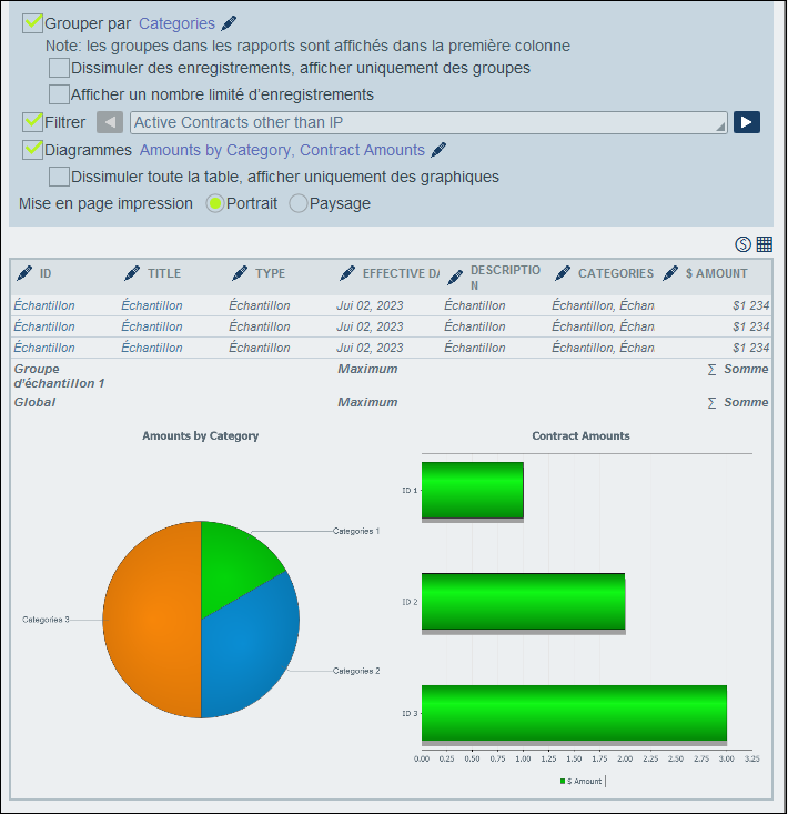 Les captures d’écran ci-dessous montrent à gauche, un formulaire de rapport dans lequel deux graphiques ont été définis et à droite, le rapport avec les graphiques.