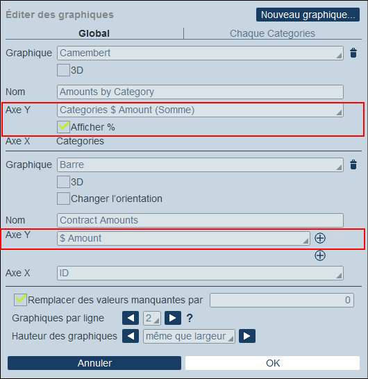1.Dans le formulaires de rapport, choisir l’option Graphiques(voir la capture d'écran ci-dessus gauche). Le formulaire Éditer Graphiques apparaît (capture d’écran ci-dessous)