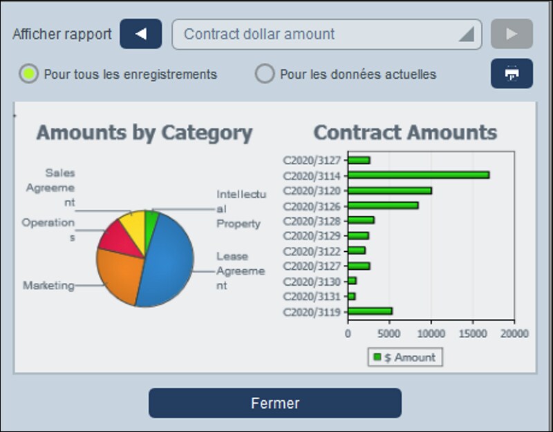 Vous pouvez générer des graphiques dans les rapports pour présenter graphiquement des données contenues dans les enregistrements. L’axe Y du graphique doit être un nombre. Cela sera le cas si, pour l’axe Y, un des éléments suivants sera disponible et sélectionné : (i) un champ ayant une valeur nombre, ou (ii) une valeur totale d’une valeur de regroupement (par exemple, le décompte des années individuelles dans l’ensemble des données : par exemple, 3 instances de l’année 2020).