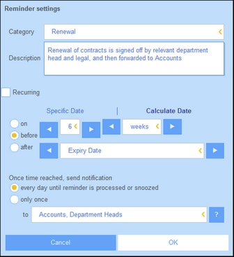 •Heure de démarrage du rappel : Il existe deux alternatives : (i) Sélectionner une date spécifique ; ou (ii) Calculer une date relative à un des champs de date (comme une date d’expiration). Dans la capture d’écran ci-dessus, par exemple, l’heure de démarrage a été définie à une semaine avant la date dans le champ Date d'expiration.