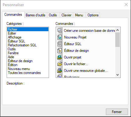 L’onglet Commandes vous permet de personnaliser vos menus ou vos barres d’outils.